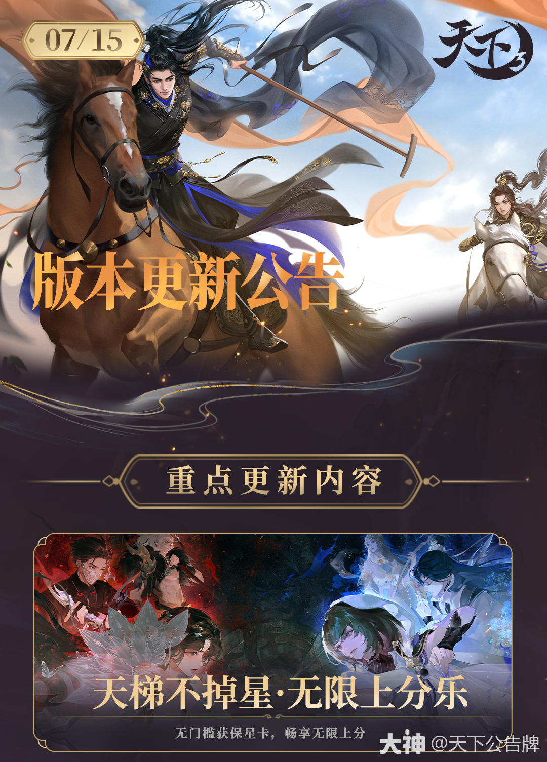 本周更新后,7月16日至7月22日,天下联赛·荣誉商店一铜上架限时道具天梯保星卡,活动期间全段位玩家均可无门槛购买,畅享无限上分的快乐!