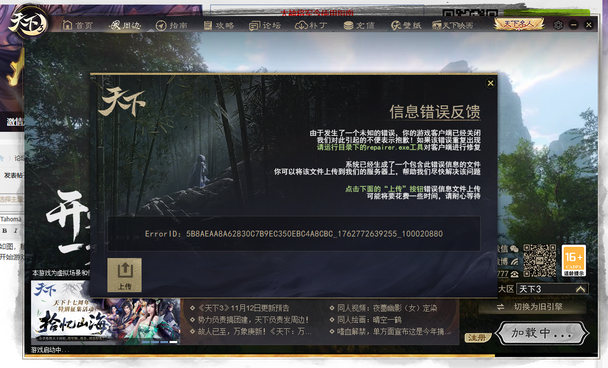 如图,楼主周六晚上游戏突然显示错误,然后让使用修复工具修复。楼主修复完之后,还是不行。于是把原游戏删除重下了一个。结果重下的是旧引擎的。接着,又下了开天版的,结果点击开始游戏还是显示错误。。。修复了还 ...
