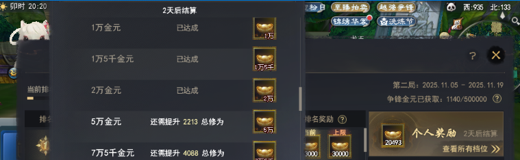 个人奖励是每周结算,排名奖励是右上角那个第二局结束才结算,你的2W多是介于2W与5W之间的奖励