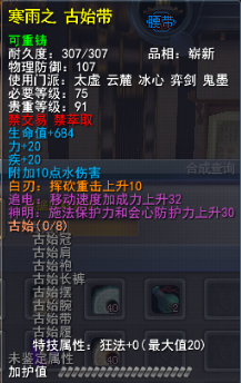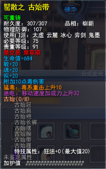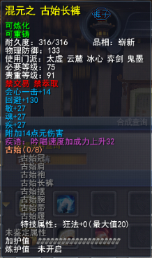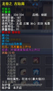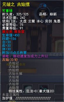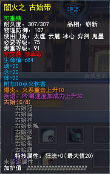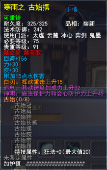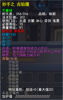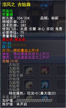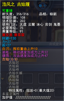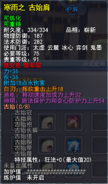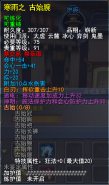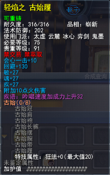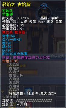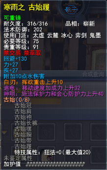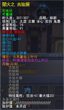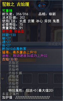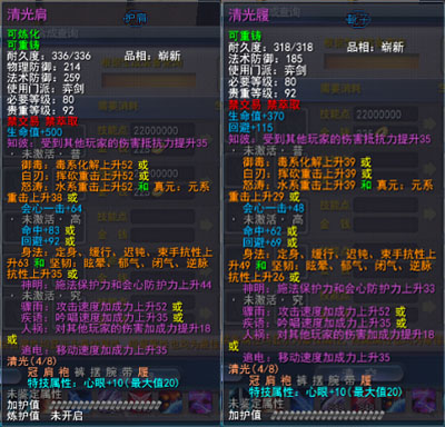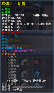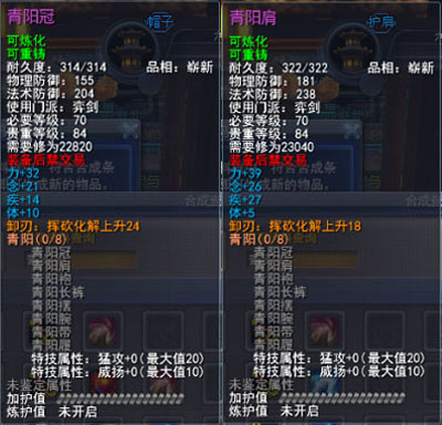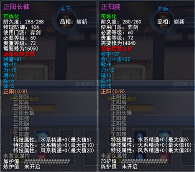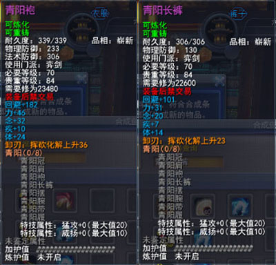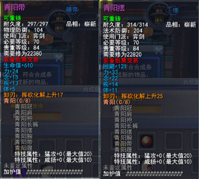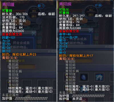 | 青阳套的固定属性在一定范围内随机,隐藏属性是卸刃即挥砍化解,每洗一次需要一件对应部件缚灵金线(在九黎城门派地可换取)的物品,部分技能点,50金,同时可以通过额外消耗一定数量的金币和技能点保留加护值。基本上花费和升级差不多。 |