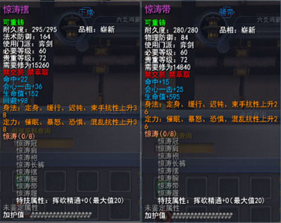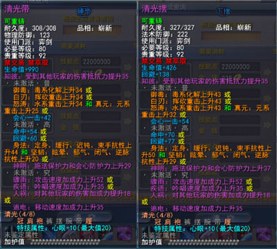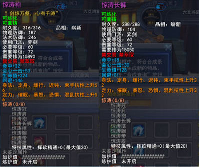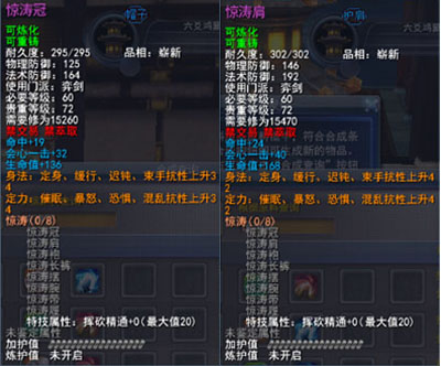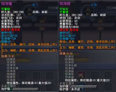 | 80级战场套固有属性中的生命值、知彼、回避属性数值为固定,每件装备最多3条可激活属性。 可激活属性为与套装相关的属性,每件装备最多有2条,分别为普通可激活属性、高级可激活属性和究极可酒瓯属性。玩家可以通过使用一定的战场声望,竞技场声望和金钱购买激活道具将其激活,激活时将会在装备可能出现的若干属性中随机选择1条附加在装备上,如果玩家对该属性不满意,还可以通过花费少量金钱将属性清除后重新激活。 普通属性激活道具:东海灵符·普:5000战场声望+10金/500竞技场声望+10金 普通属性清除道具:武烈炼符·普:1金 高级属性激活道具:东海灵符·高:13500战场声望+10金+300王朝军姿/1350竞技场声望+10金+300王朝军姿 高级属性清除道具:武烈炼符·高:3金 究级属性激活道具:东海灵符·究:26600战场声望+10金+600王朝军姿/2660竞技场声望+10金+600王朝军姿 究极属性清除道具:武烈炼符·究:5金 以上6种道具可以在各门派九黎城内驻地的东海舰队军需官处购买。 |