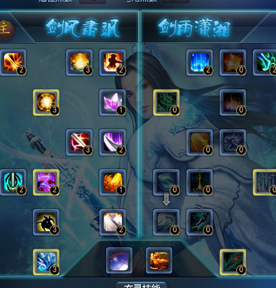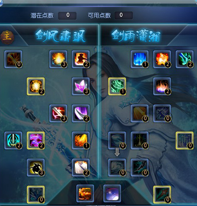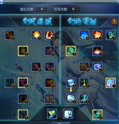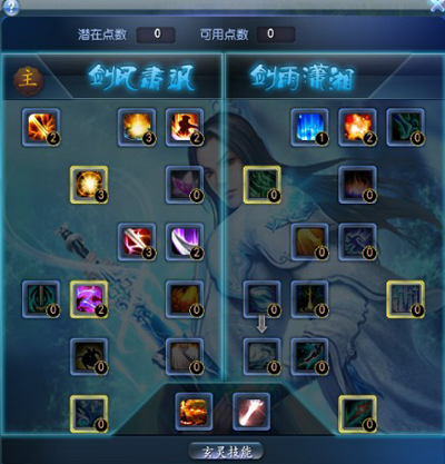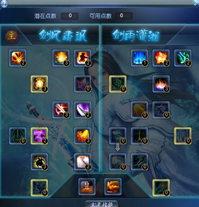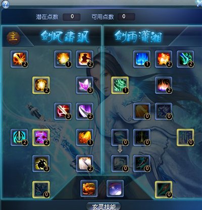 当玩家达到30级后,玄修系统会自动开启并获得第一个潜在玄修点数,点击技能面板右边的“玄修”按钮即可打开玄修界面。每当玩家达到特定等级时,玩家会获得潜在玄修点数,通过消耗金币和技能点可以将潜在玄修点数转化为可用玄修点数。80满级后,最多有33个玄修点。 每个门派有2系玄修技能,弈剑听雨阁分别为剑风肃飒和剑雨潇湘,玩家首先要决定自己要选择哪一系作为自己的主玄修。在主玄修上,玩家可以较为自由地分配可用点数,而主系的另一系玄修则需要主玄修上已经分配了足够的点数。玄修技能分为主动被动两种,主动技能可以直接拖入快捷栏中使用。 玄修技能目前已开放两系,每系各18个技能,3个主动,15个被动,其中1.2玄修只要在不同的玄修技能上进行可用玄修点数加点,就可以获得该技能了;3玄修的加点方式略复杂,下面会详细的说一下。需要注意的是:一般高等级的玄修技能都需要已经在该玄修系上分配了一定的点数才可以加点,而玄修技能在加点数不同时,技能效果也会有着显著的差别。
