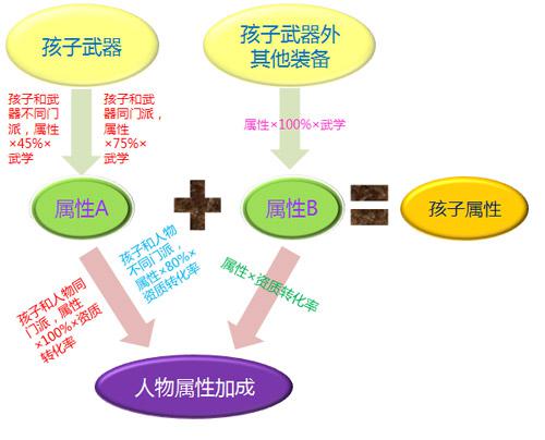 孩子的高级属性主要有孩子技能附加属性和孩子的装备属性2部分构成 10级固若金汤增加1000物理防御 10级万法难侵增加1000法术防御 10级破军增肌165点最大物理攻击力 10级狂澜增加165点最大法术攻击力 孩子的装备为6件分别为:头饰,肚兜,裤子,鞋子,项圈和武器;分别由人物的帽子,衣服,裤子,鞋子,武器,项链转换而成。 孩子装备获得:人物装备转换,转换道具在九黎蒙学馆“楼月”处购买。根据准备的颜色、必要等级购买合适的转换道具:如意春风剪,银梭金缕线或乾坤再造锤,对小于等于80级的橙色、紫色或金色人物装备使用,所获得的孩子装备无使用等级限制 属性:除追电、疾语、骤雨、神明、明思、扰心、人祸、知彼、状态命中力、装备特技等属性外其他属性在转换后保持不变 加护:装备转换后加护值和加护效果保留,加护、化溟规则与人物装备相同 鉴定:装备转换后鉴定效果消失 炼化:装备转换后炼化属性将会替换为点化属性,点化属性类型及数值与原炼化无关。 | |||||||