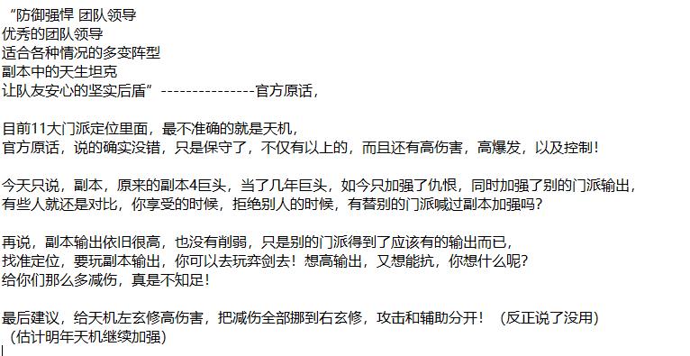 | 最后的建议不错,我作为天机我支持,只求加强到yj输出80%,剩下的我自己充。身板不要也罢,仇恨直接归零,都没问题。 |