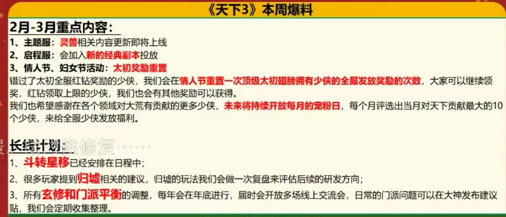 | 什么安排日程中,就不能给大家明确个时间,最近论坛缝号风声比较大,给玩家吃个定心丸。去年画的饼今年都没吃上,画完4又画这个,策划想干什么 |